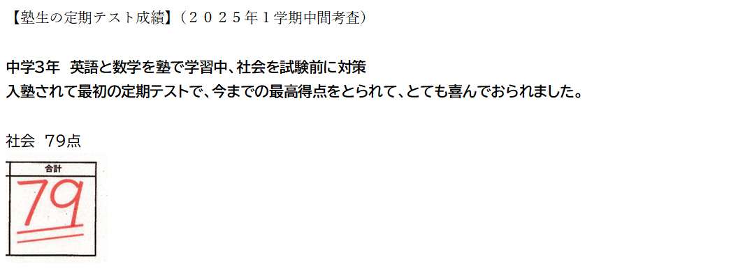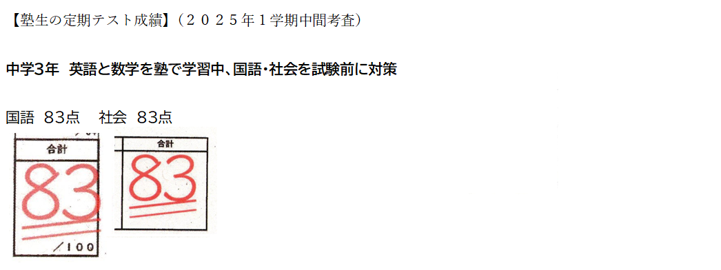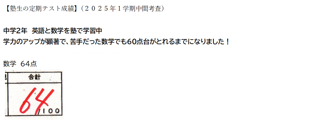 塾生の定期テスト成績(東久留米市・清瀬市・東村山市、中学校、2025年1学期中間考査)